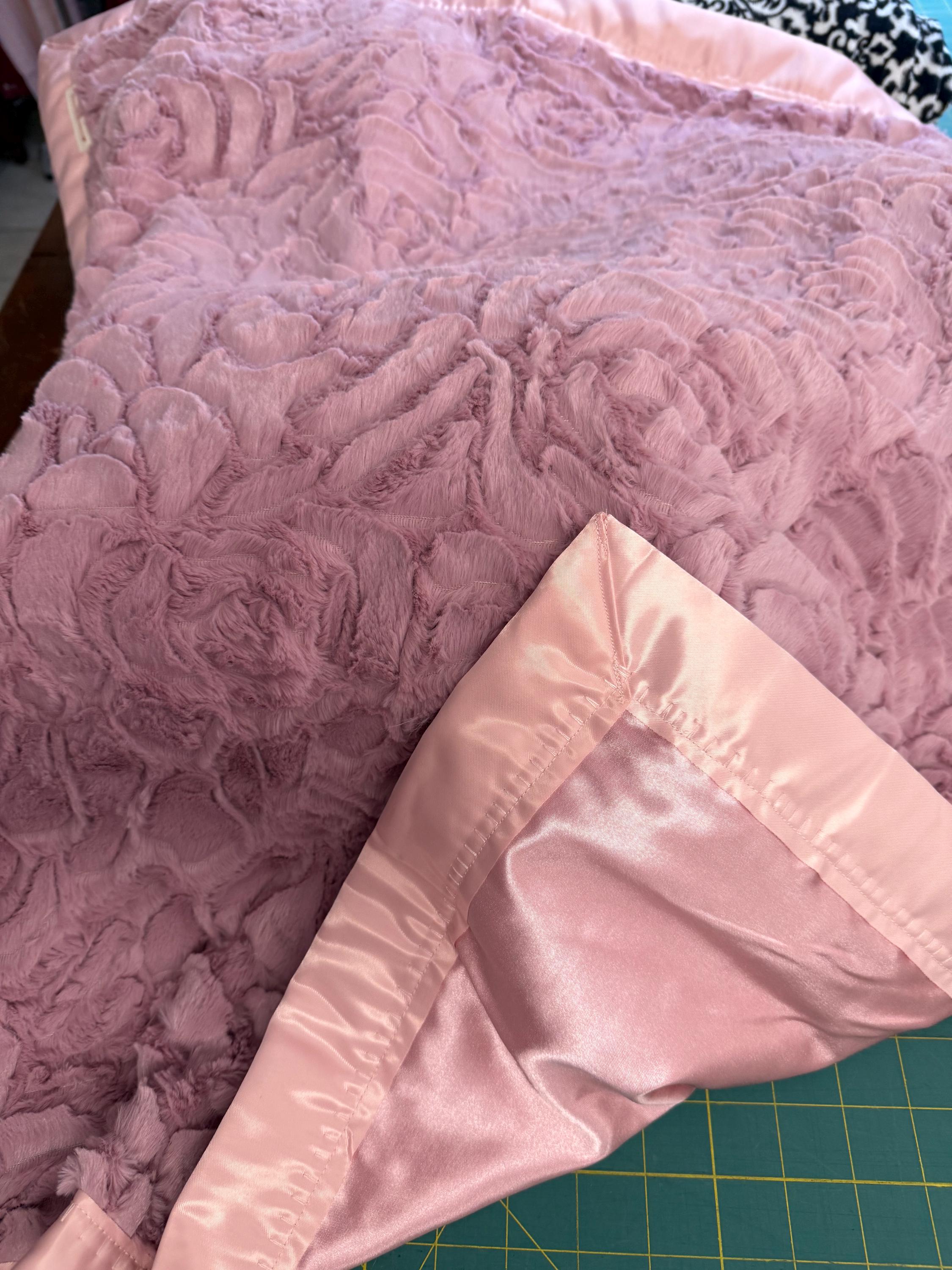 Stunning dusty rose blanket in two sizes. Both have satin backing and binding making this blanket a soon to be favorite. This minky design is an embossed rose giving it a super soft texture. FREE embroidery.