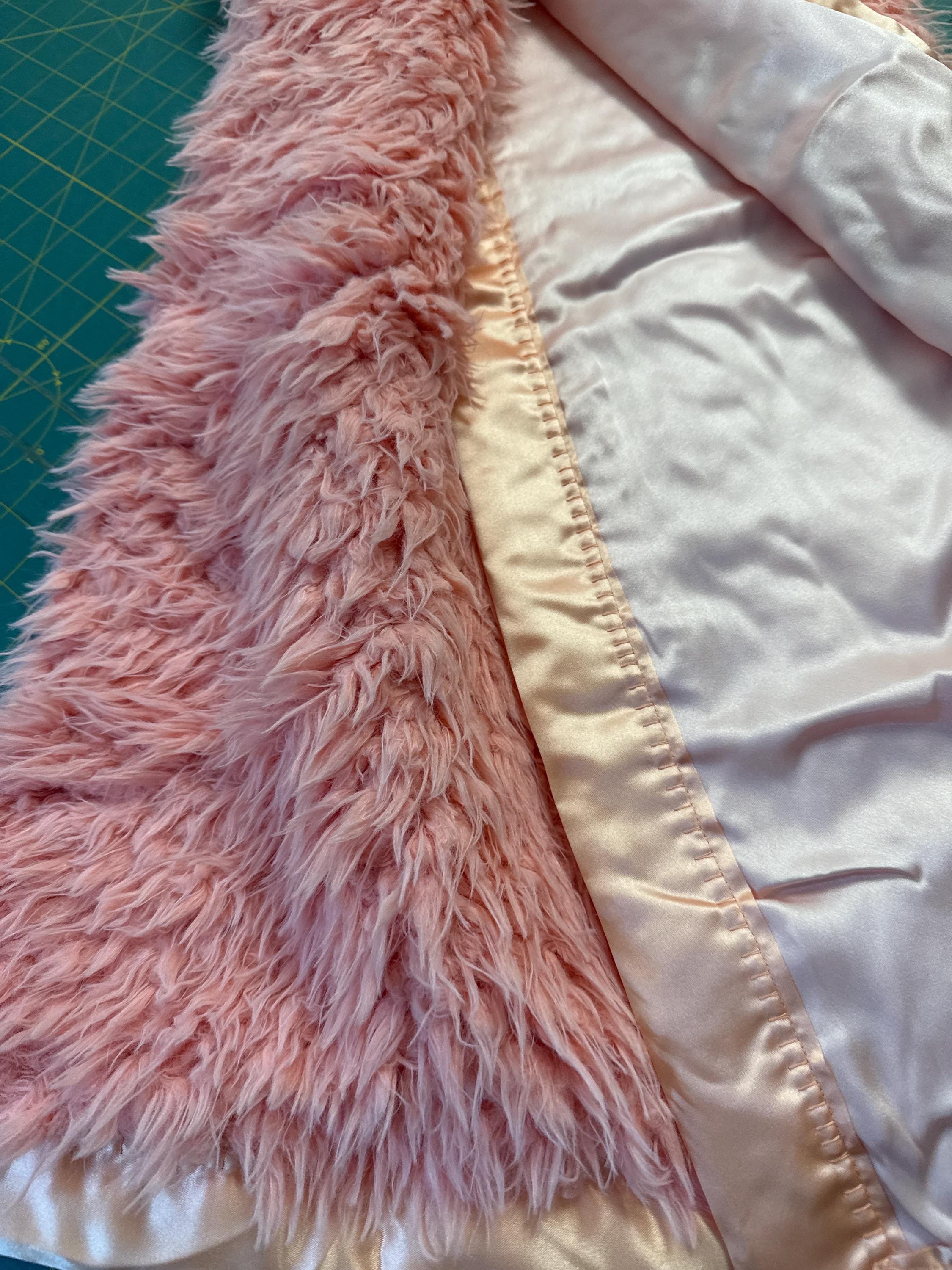 Fun fuzzy and can even be embroidered with a name. This shaggy minky and satin blanket is in shell pink that is in between pink and coral. Available in two sizes.