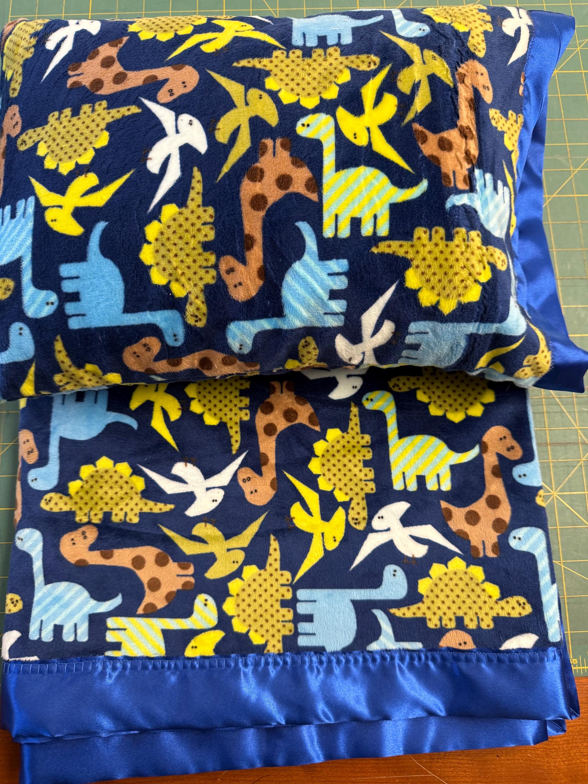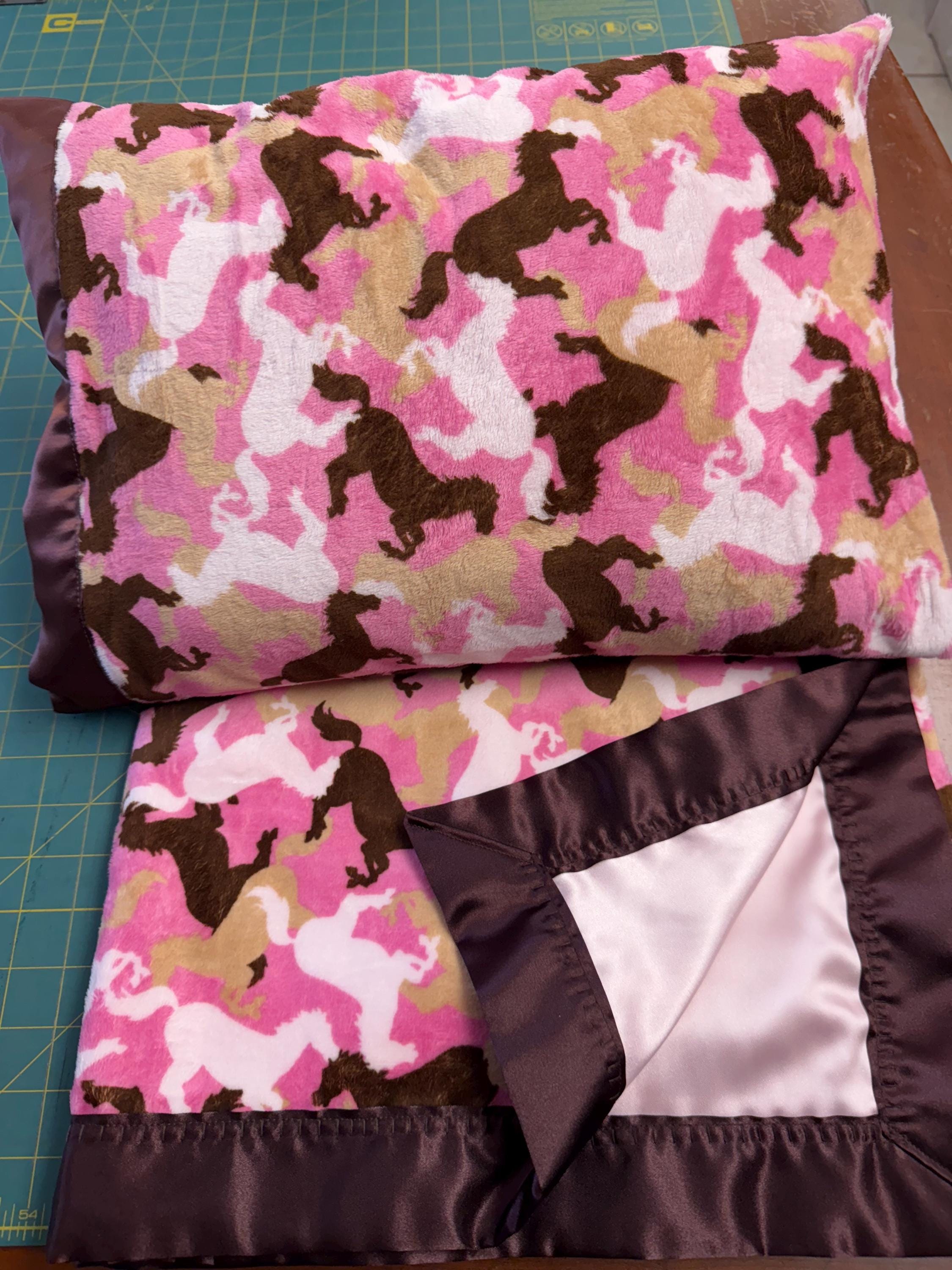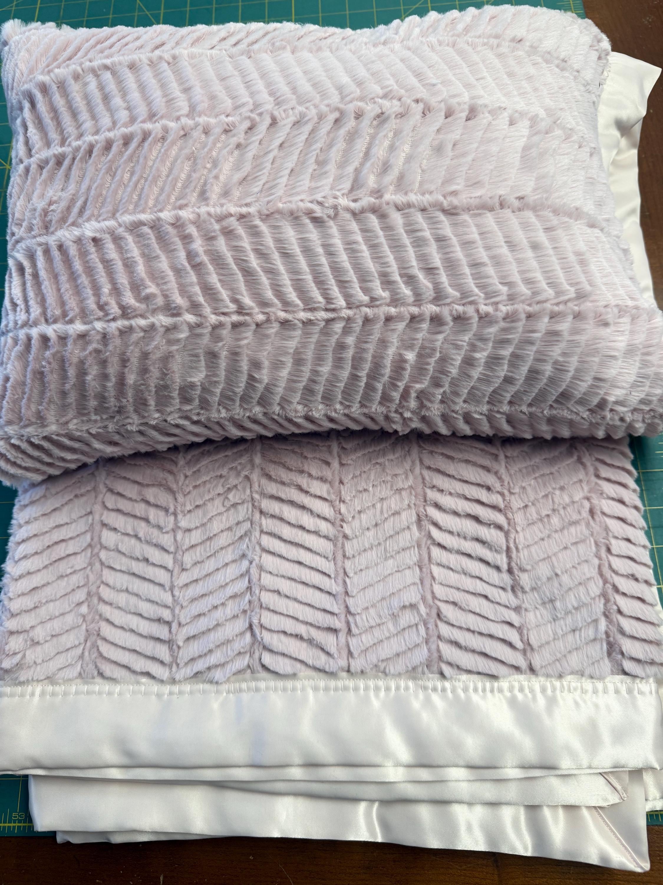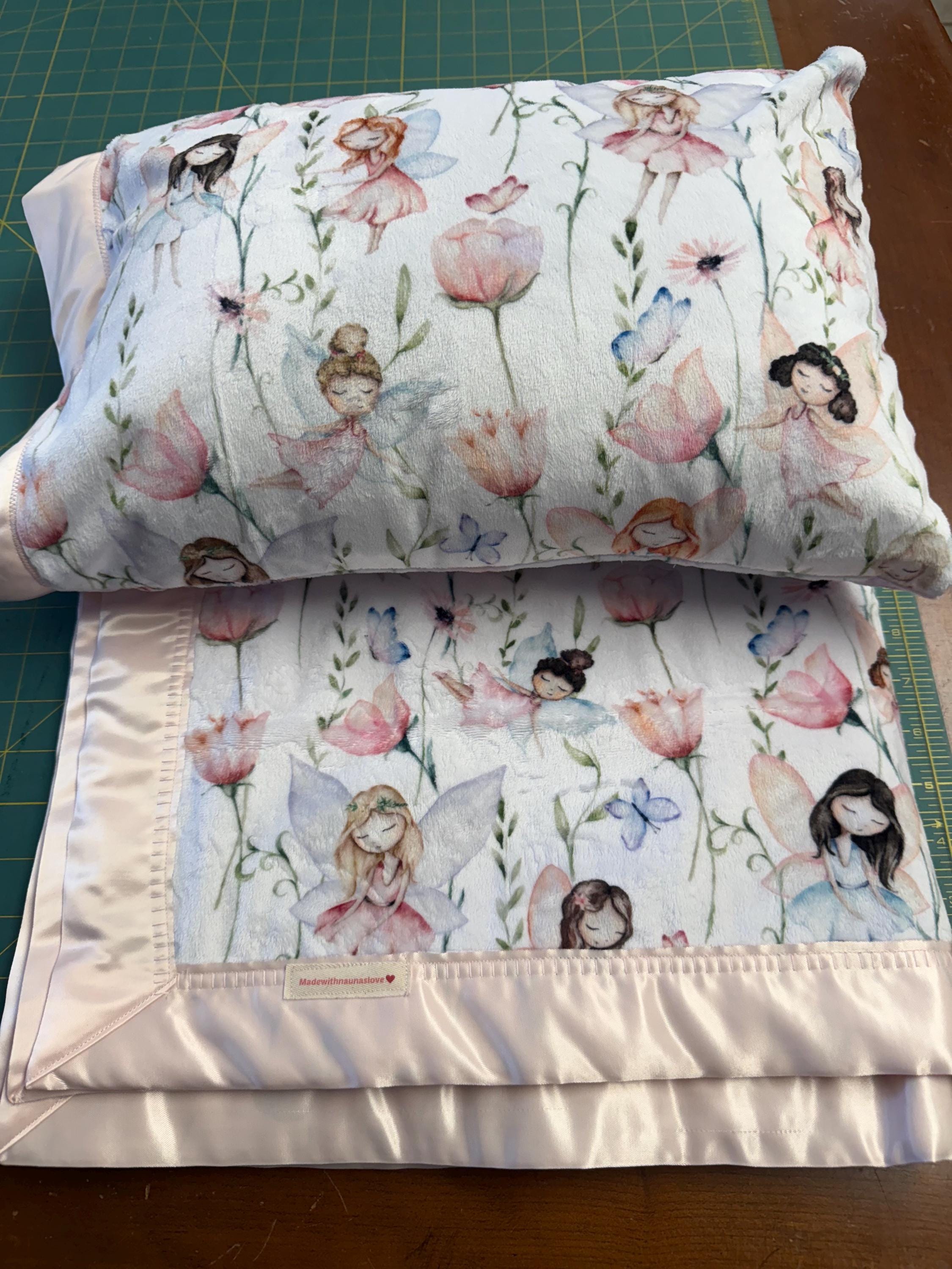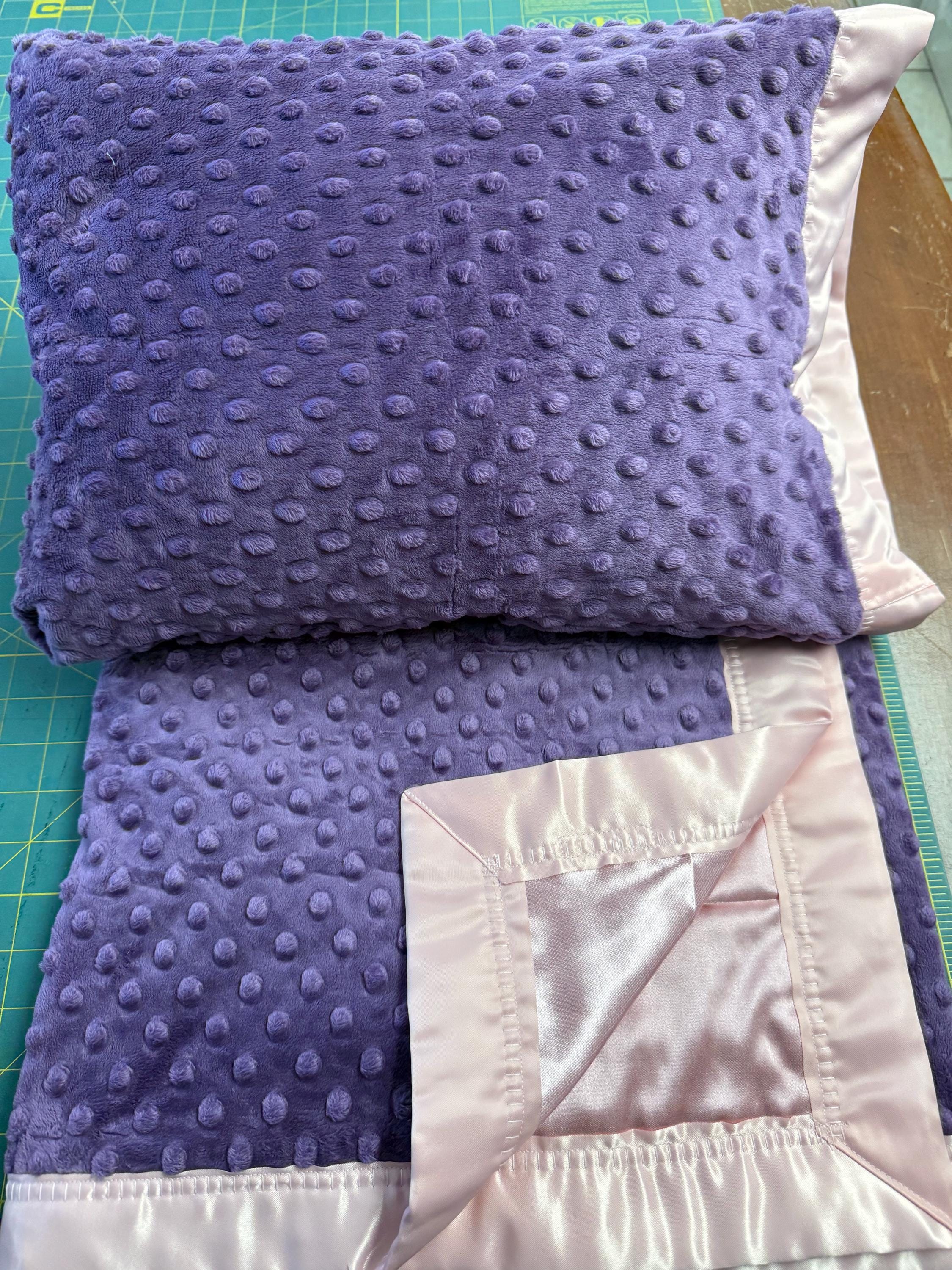 Beautiful, super soft minky and satin baby blanket, 35 x 60 with matching 12 x 16 pillow. This set is perfect for travel or children up to age 7, for preschool nap time or a special airplane trip! FREE embroidery on the blanket. Thanks for shopping madewithnaunaslove baby boutique where everything is handmade.