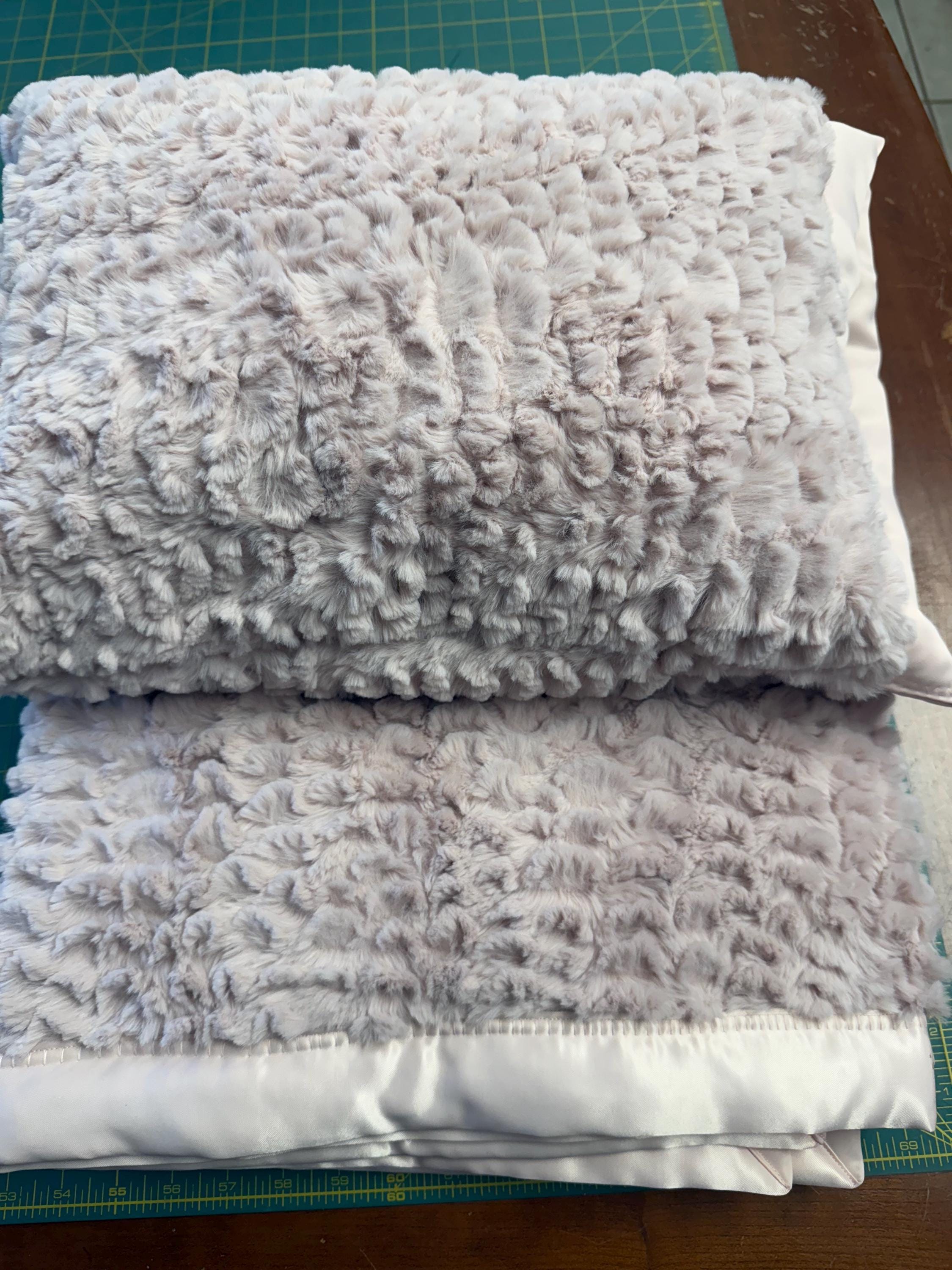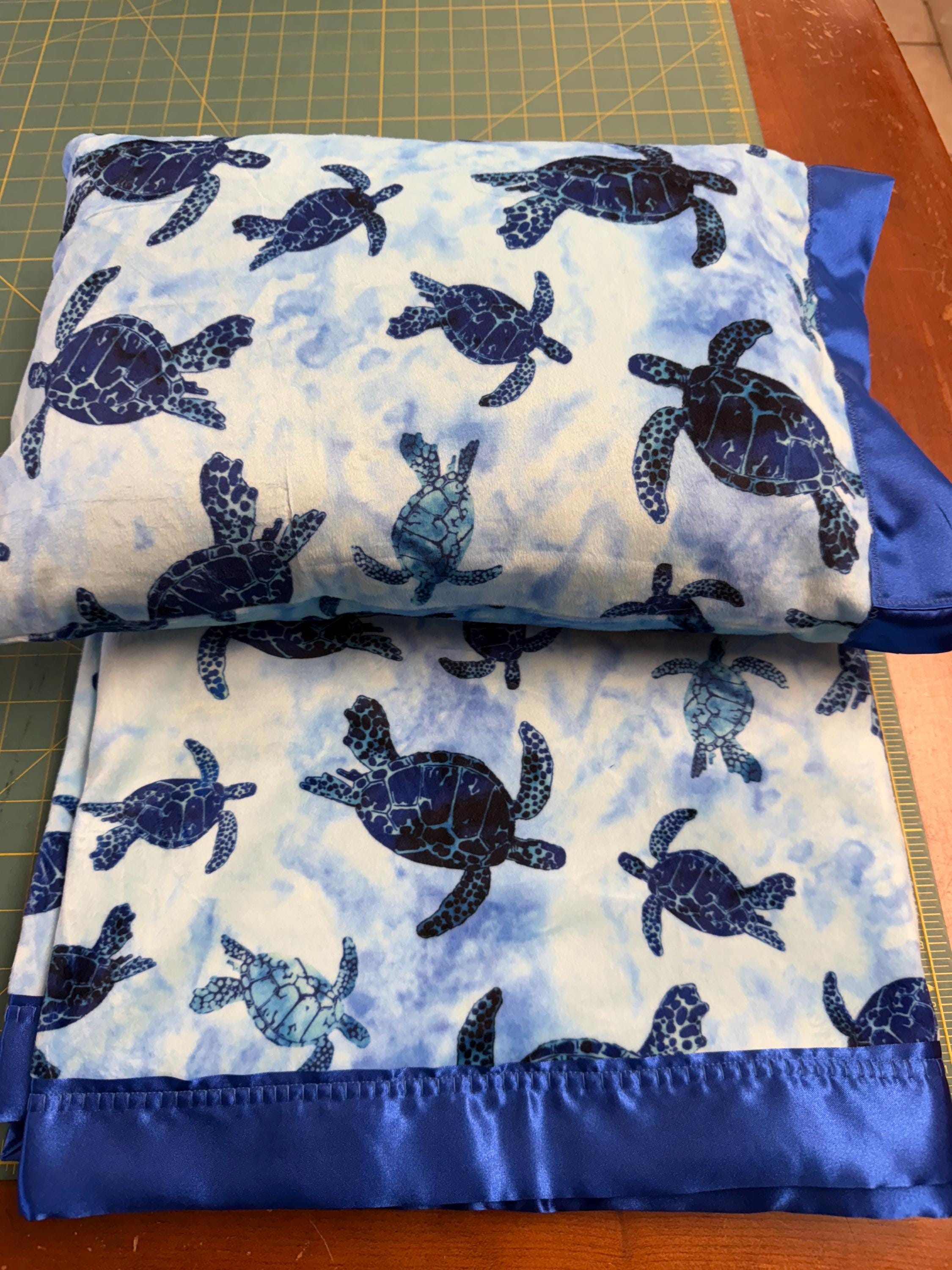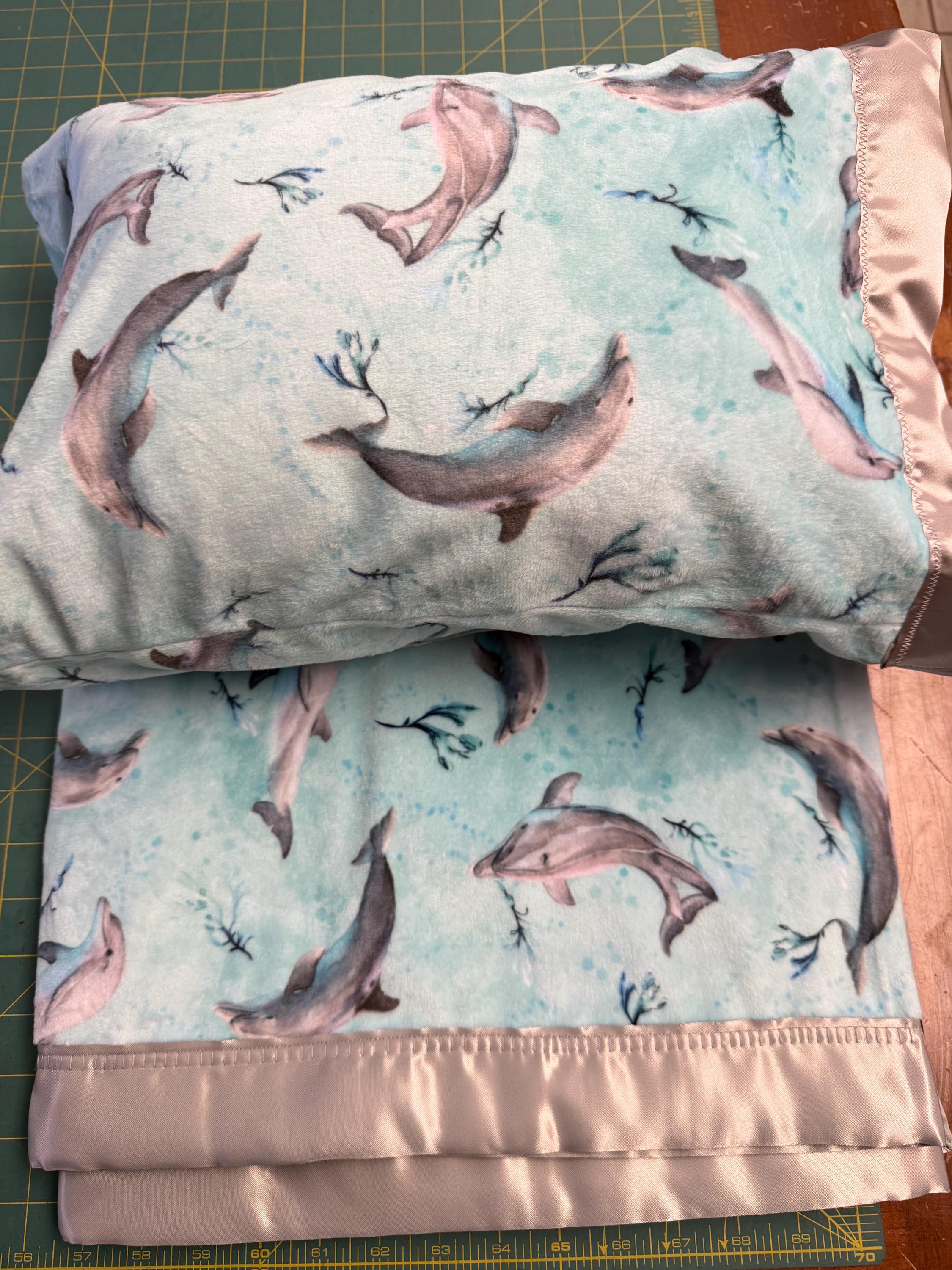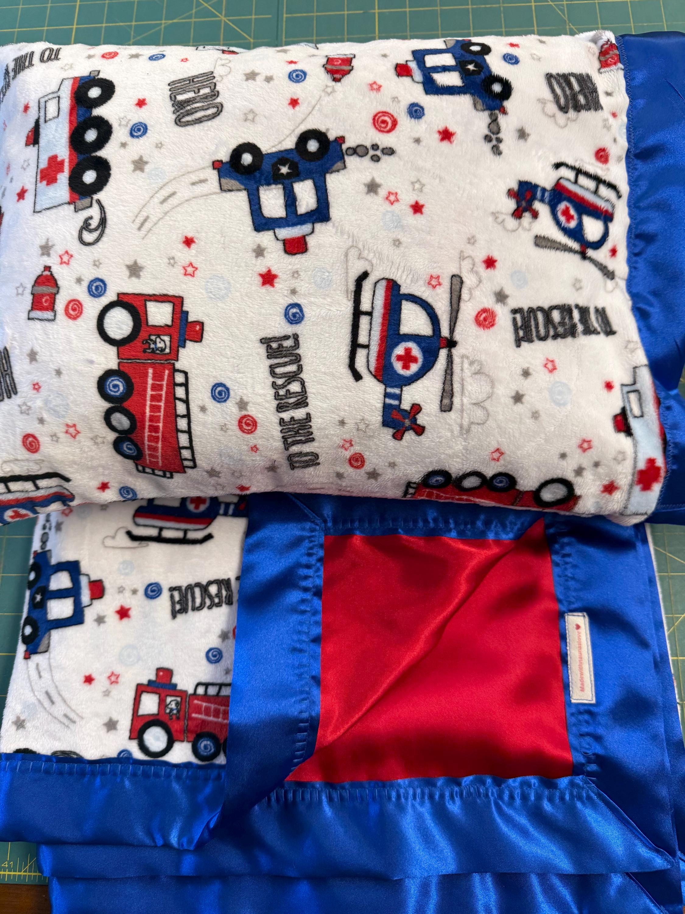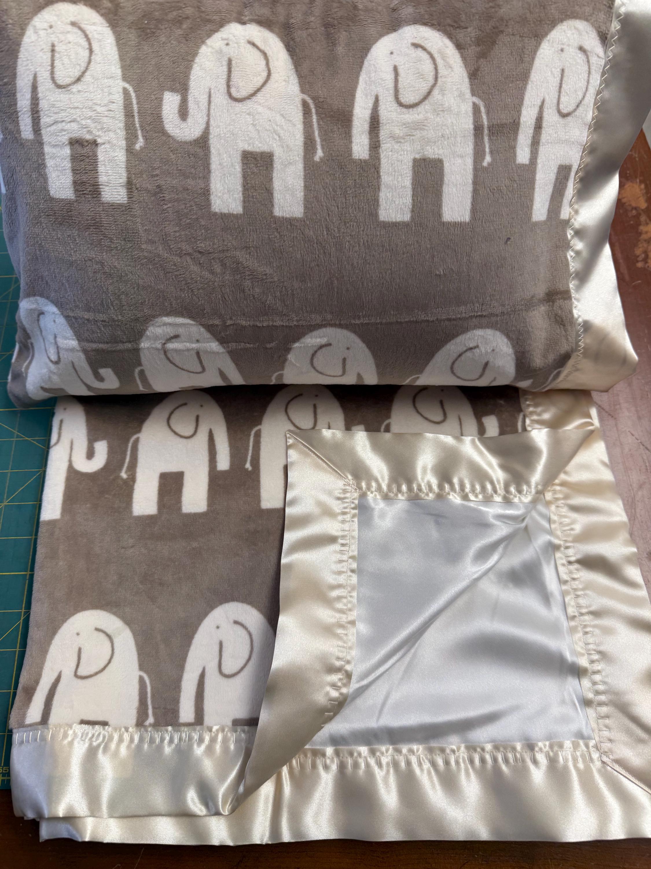 Beautiful, super soft minky and satin baby blanket, 35 x 60 with matching 12 x 16 pillow. This set is perfect for travel or children up to age 7, for preschool nap time or a special airplane trip! FREE embroidery on the blanket. Thanks for shopping madewithnaunaslove baby boutique where everything is handmade.