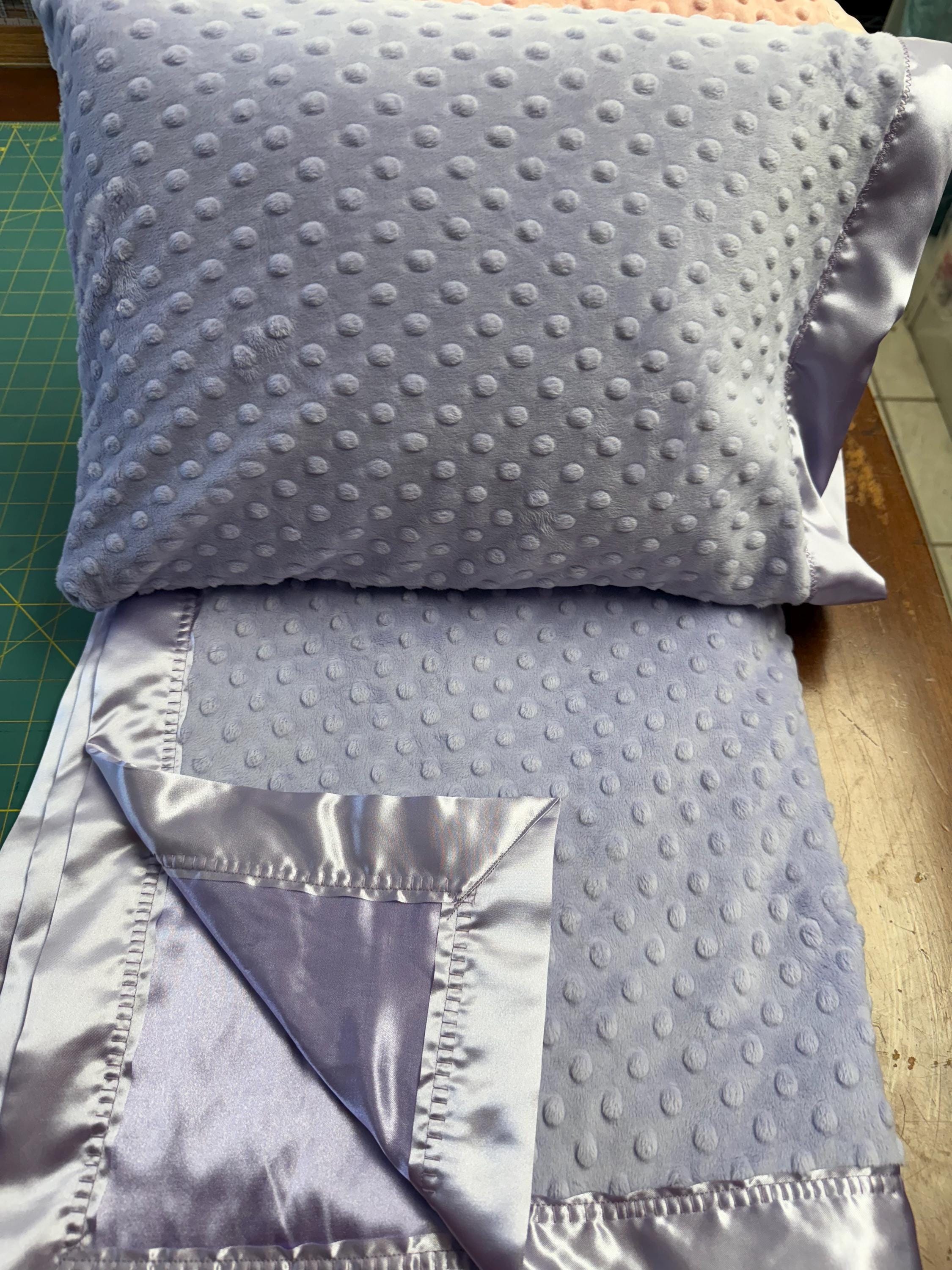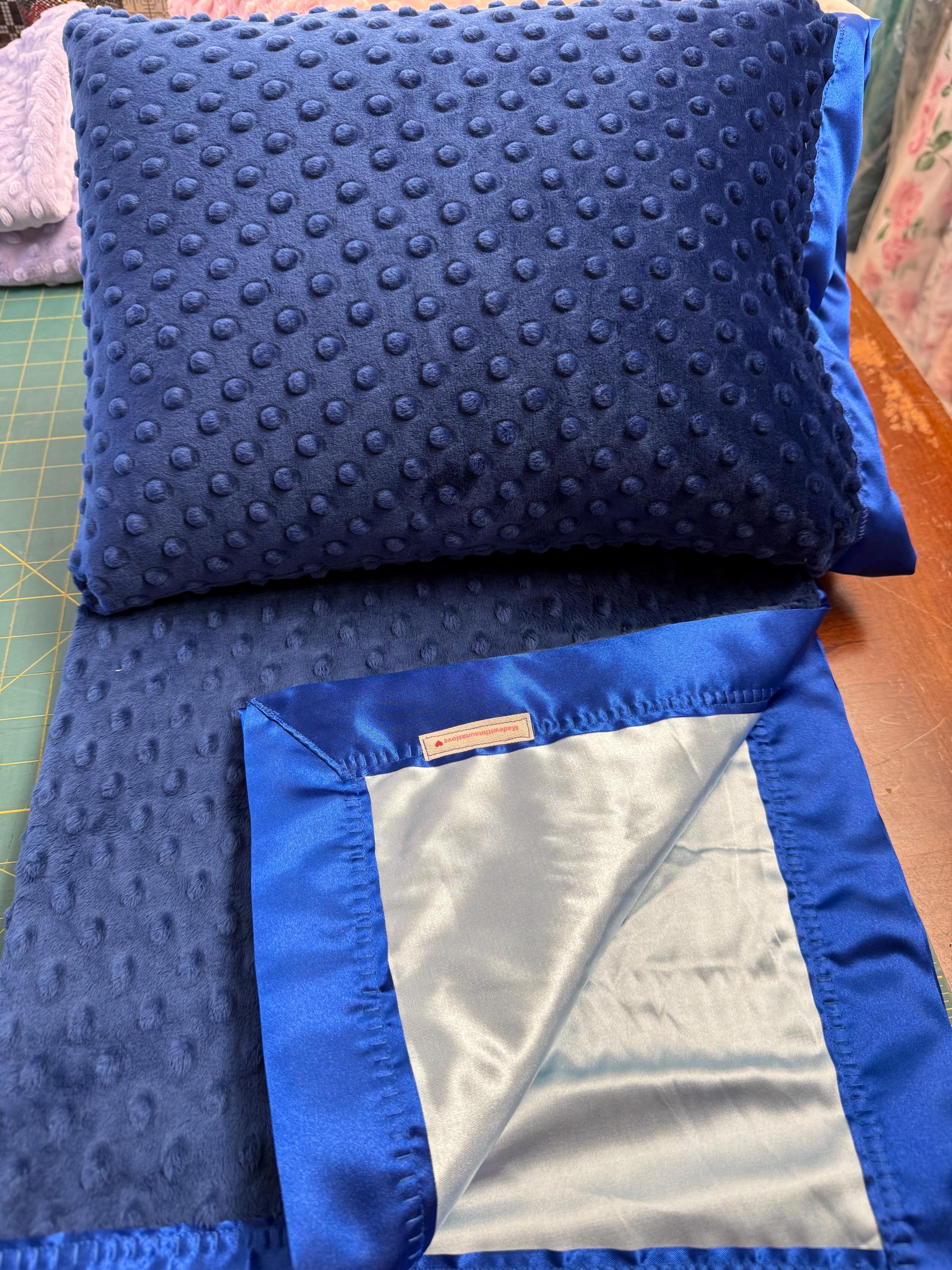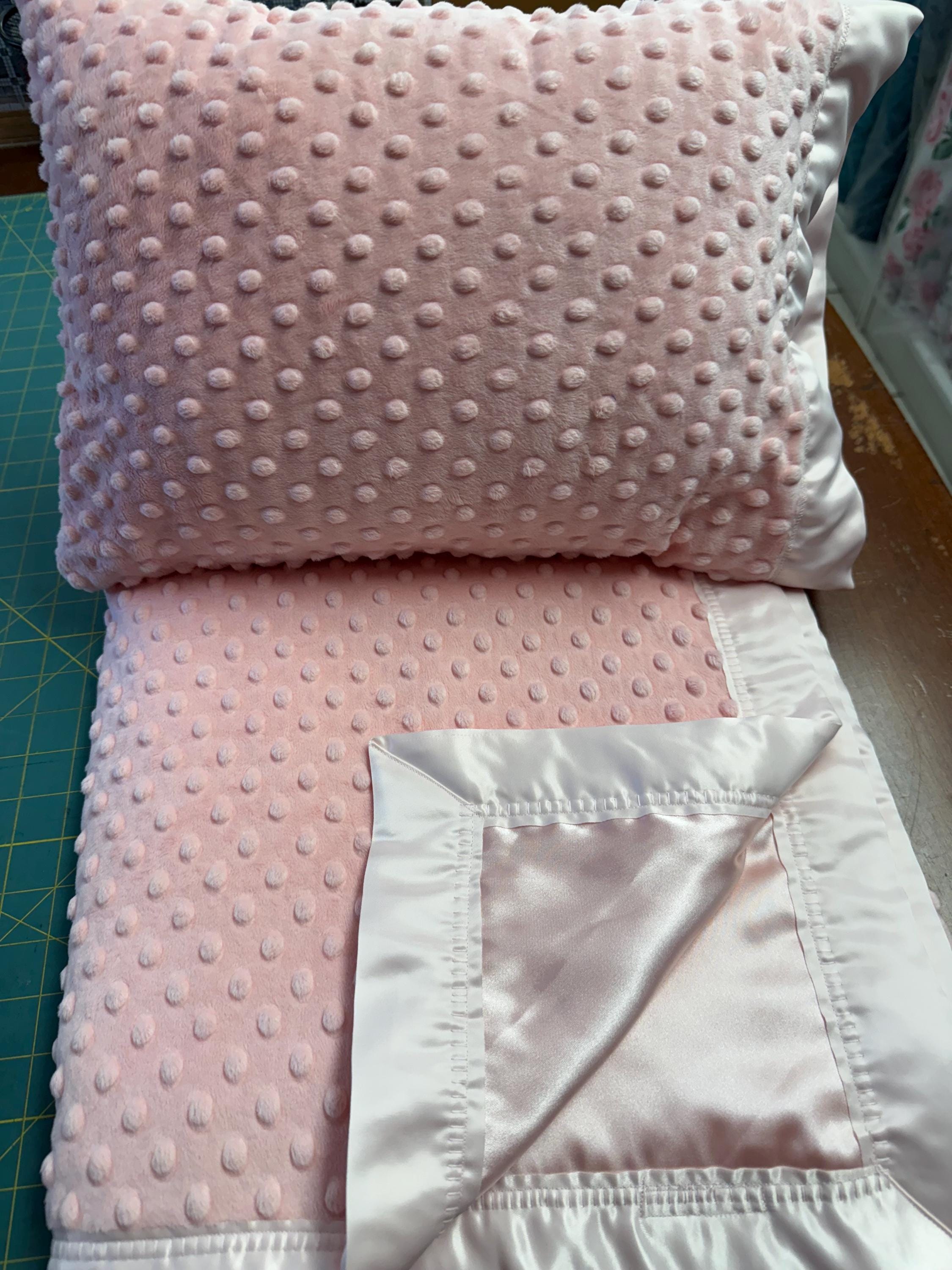 Beautiful, super soft minky and satin baby blanket, 35 x 60 with matching 12 x 16 pillow. This set is perfect for a special crib set, travel or children up to age 7, for preschool nap time or a special airplane trip! FREE embroidery on the blanket. Thanks for shopping madewithnaunaslove baby boutique where everything is handmade.
