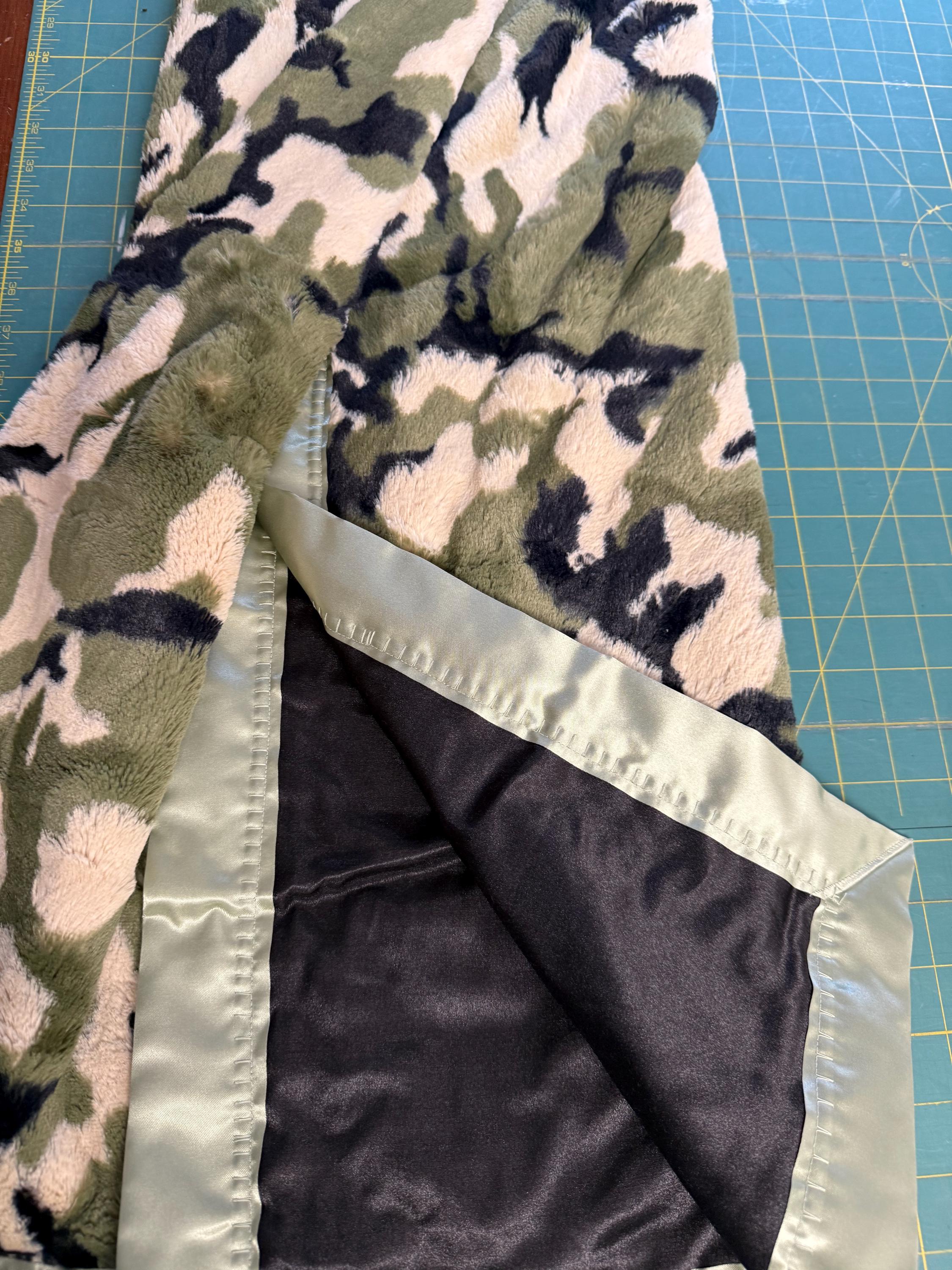 Super soft and fluffy and ready for a camo lovers couch or bed. This large throw measures 60 x 73 inches and is snuggly soft. Add a name for a nice personalized gift. Colors are Army green, black, ivory and the blanket has black satin on the back and is edged in sage green satin binding.